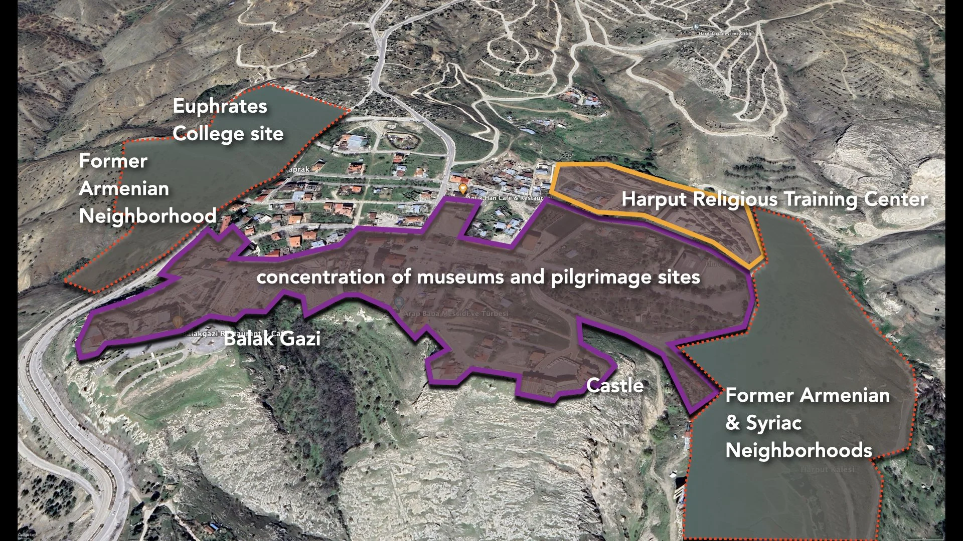 Figure 16b. An aerial view of Harput illustrating the gaps in its urban fabric. Google Earth Map and Google Earth Map reworked by the author.