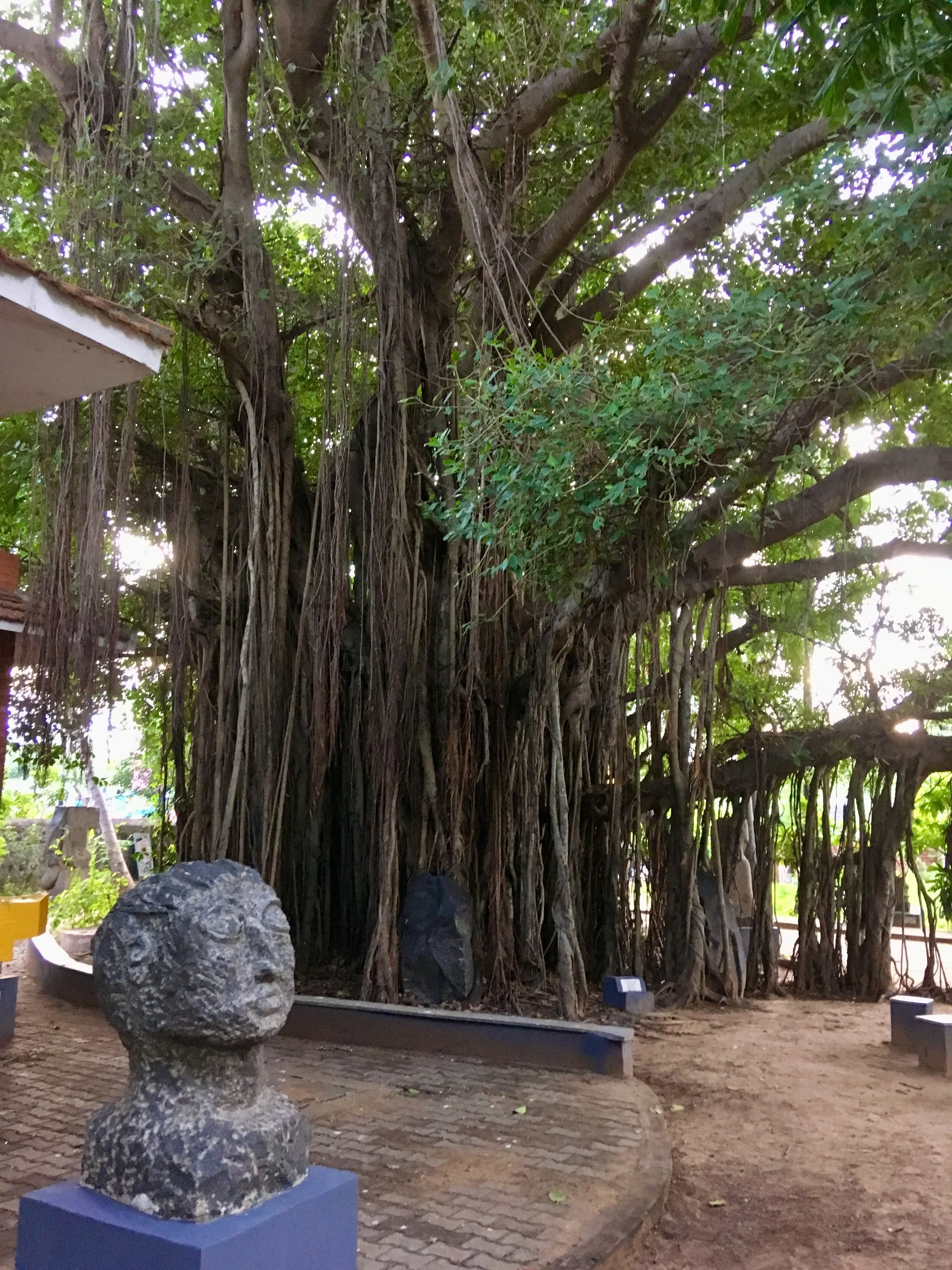 Figure 2. Banyan tree at Cholamandal entrance, with sculpture in foreground by Irish artist Niall Walsh (Head, 1988-90, granite), photograph by the author.