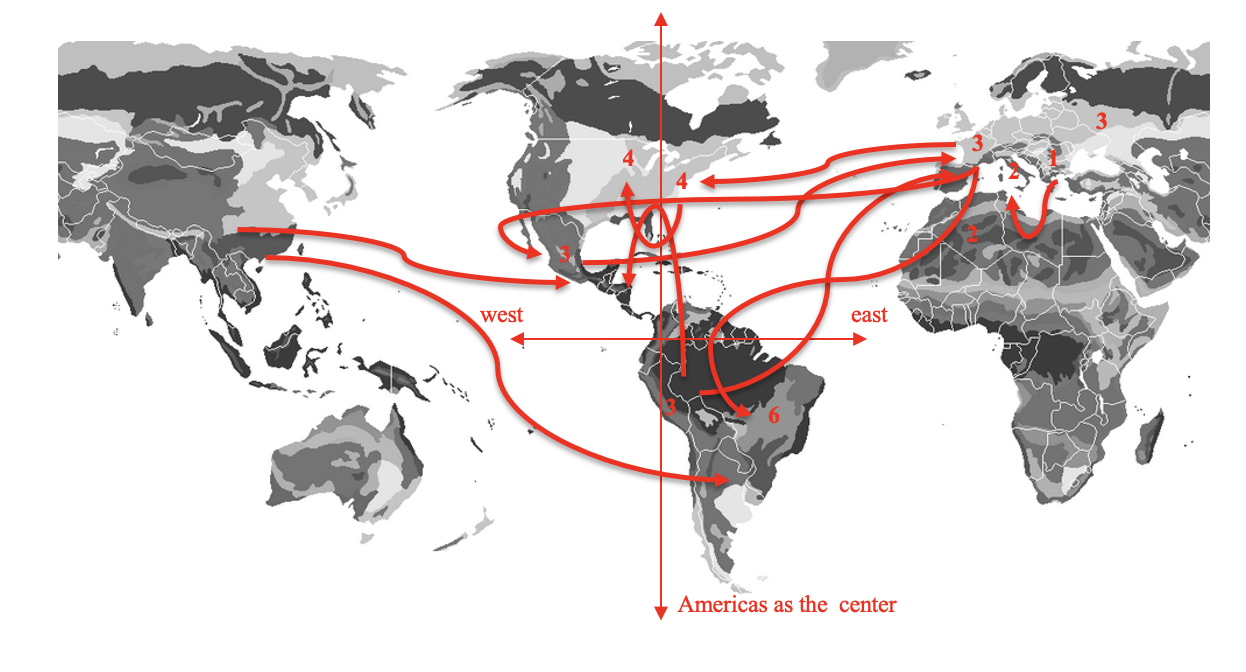 One direct outcome of my Americentric narrative is that the traditional Cartesian directions get shuffled: Europe is to my East and China to my West, a shift of directionality that forces us to rethink those categories. Seen from the Americas, the data points of architectural history are indeed perceived differently (Figure 5).