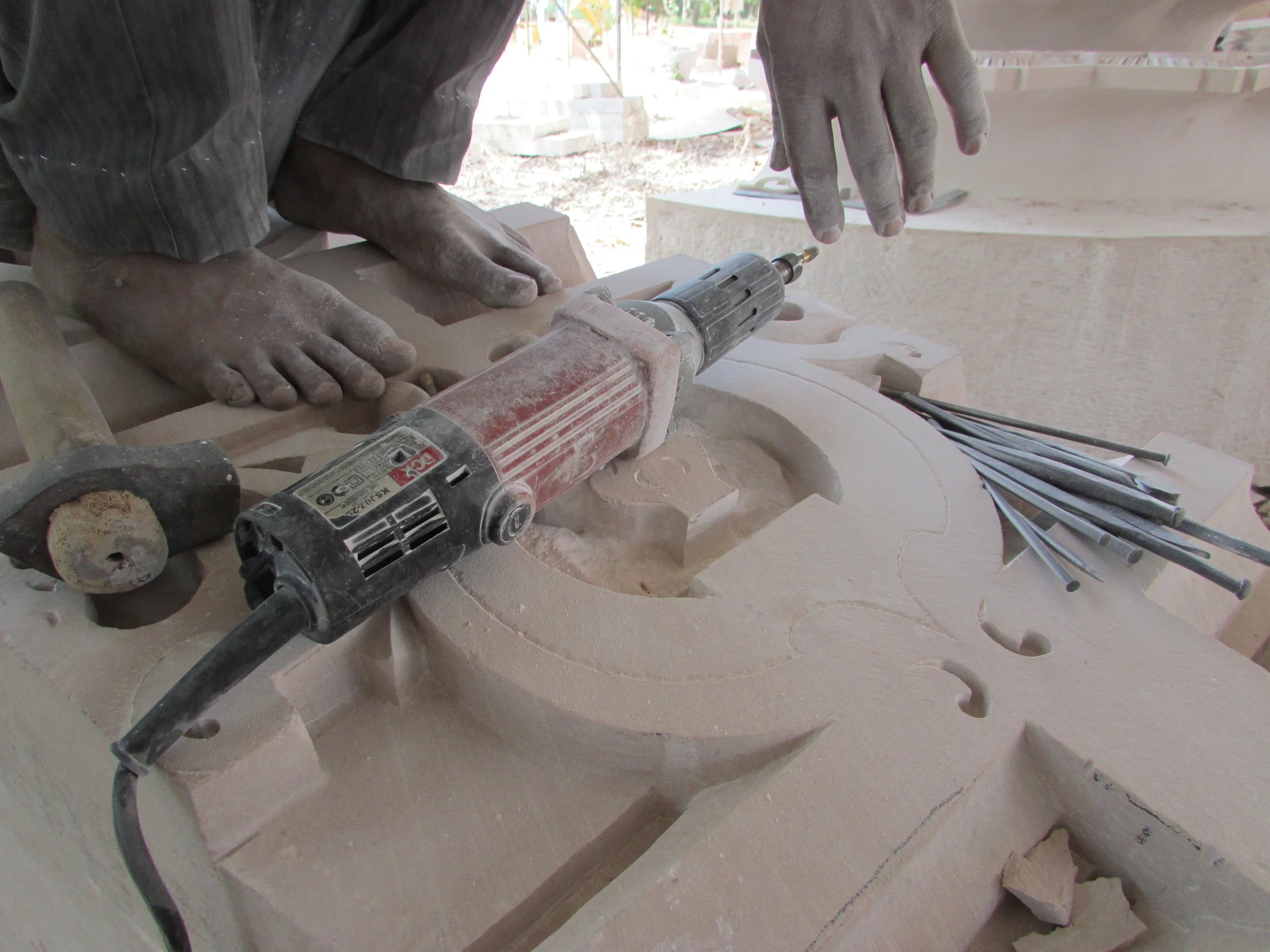 Figure 6. A combination of hammer, chisels and power tools used for carving bansipahadpur stone at a temple-building site in Gujarat, 2018. Photograph by author.