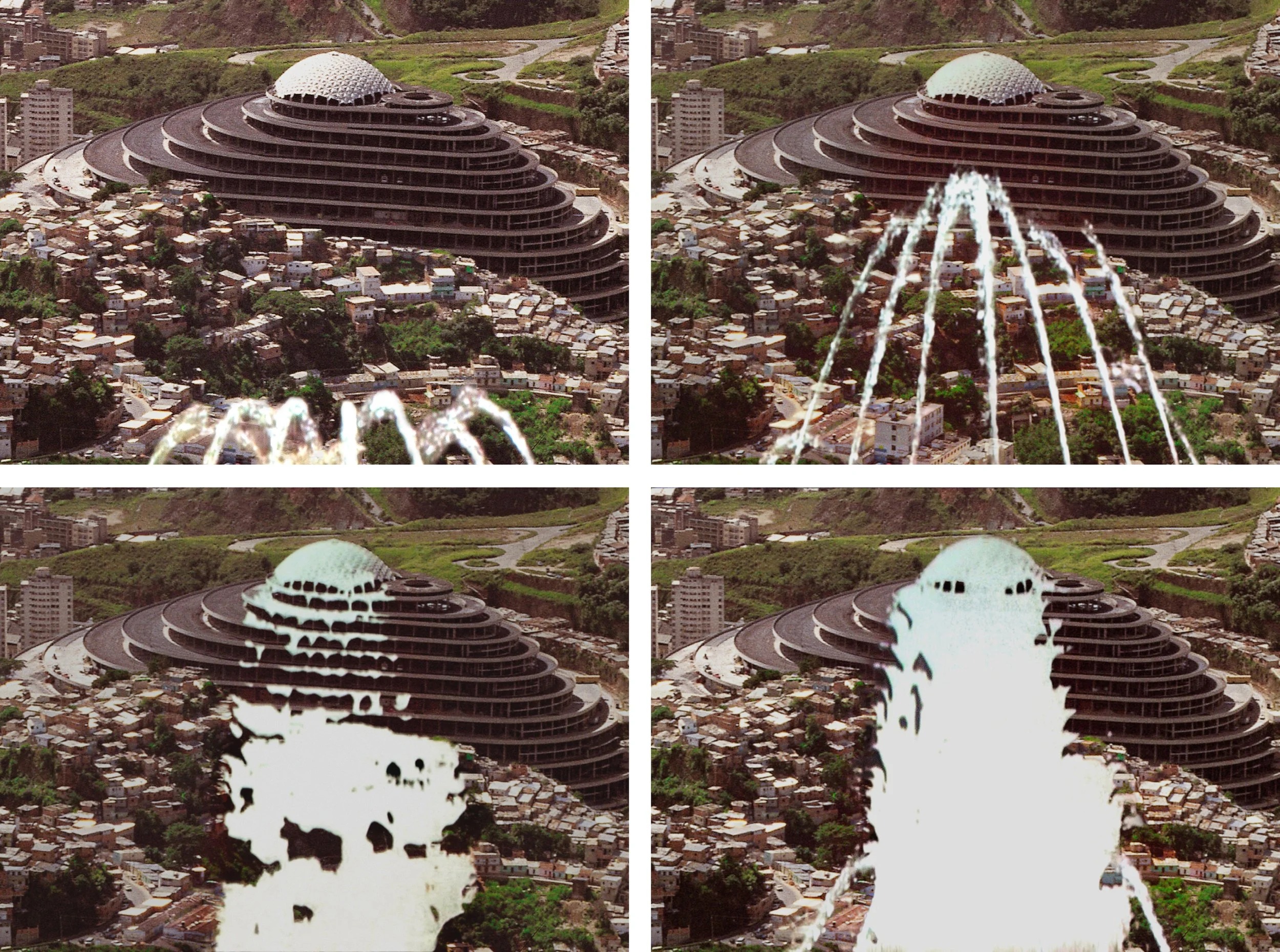 In 2003, the Venezuelan artist Alexander Apóstol created a series of videos titled Caracas Suite, in which familiar sites of the Venezuelan capital are metaphorically washed away by a fountain of water. One of the icons is El Helicoide, which is drained of meaning by the jets that visually flatten its ziggurat-like form into a field of white (Figure 6). The water stains the image while simultaneously evoking purification, of a kind that any future conversion into a cultural center will never fully be able to achieve. But a site like El Helicoide can never be emptied of significance; on the contrary, it is overburdened by its history. As Apóstol says, El Helicoide is “an enduring reminder of the inefficiency of our system and our immense capacity to imagine and to desire.”