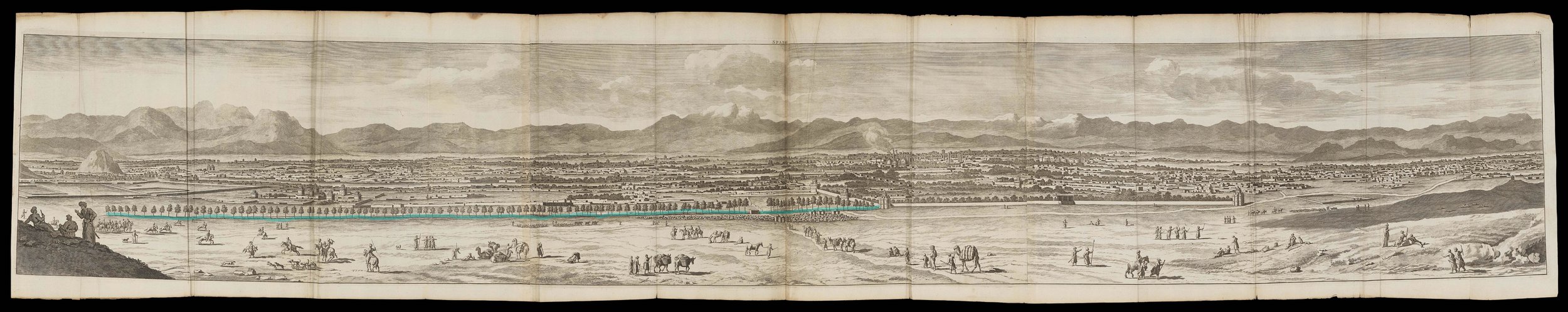 Figure 3. Lined with a row of trees, the canal delivered the water of Zāyandehrud to the southern plains of Isfahan facilitating the expansion of the city, its gardens, and verdant and water-laden public spaces. Cornelis De Bruyn, Travels into Muscovy, Persia, and parts of East Indies, vol.1 (London, 1737). Digitized by Boston College, via HathiTrust Digital Library.