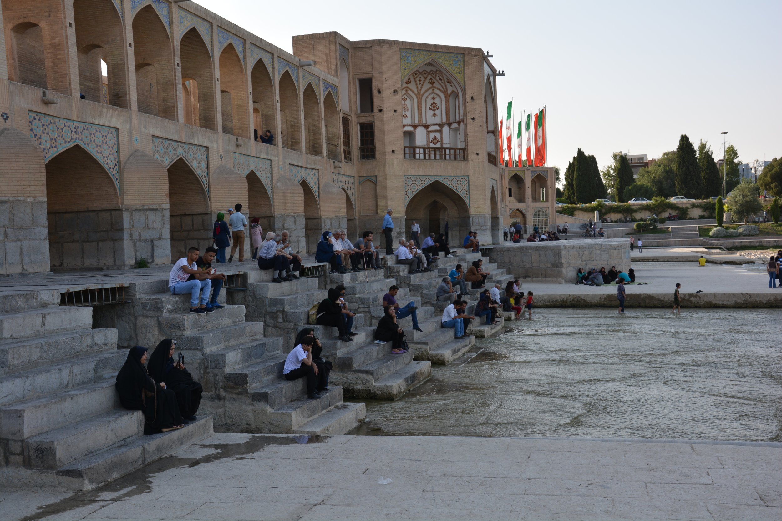 Figure 5. People gather on the steps and within the arcades of the Khāju Bridge, resting and socializing, a social practice as old as the bridge itself. Isfahan, Iran. Photo by Sahar Hosseini.