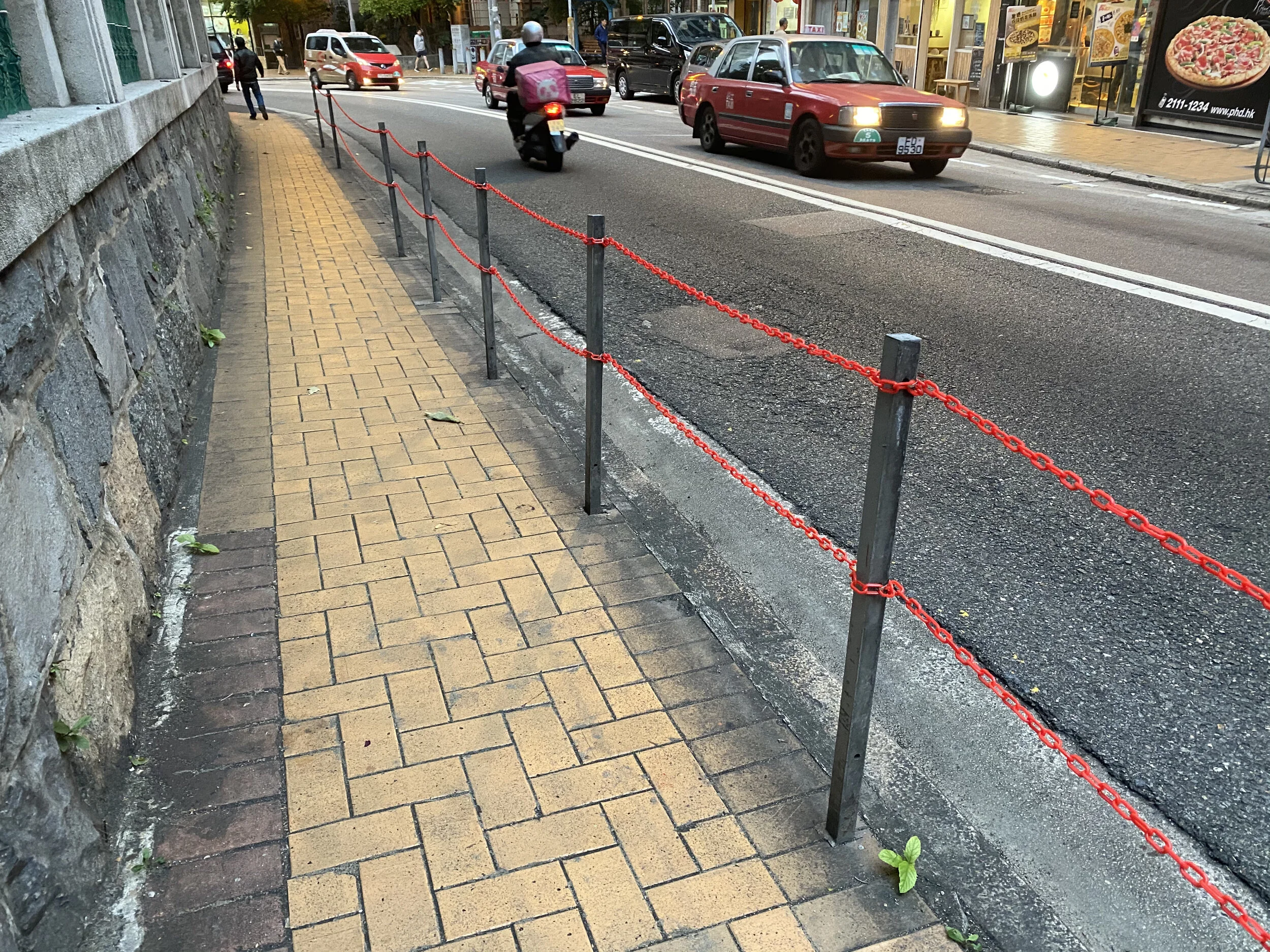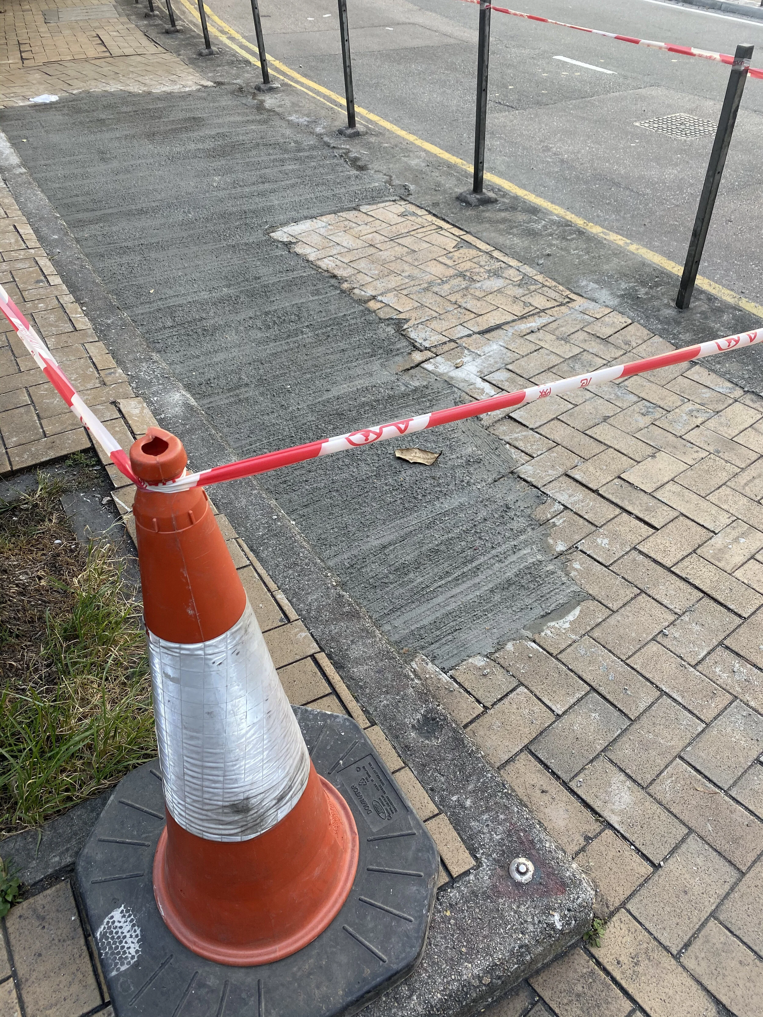 More noticeable during the protests were the pedestrian fences detached from sidewalks. These fences line hundreds of kilometers of Hong Kong’s roads and are set back from the edge of the curb, corralling people into sometimes already cramped walkways. Despite experiments in other cities that showed how removing these barricades does not increase traffic accidents, the Transport Department continues to delimit sidewalks in the name of safety. Protestors dismantled approximately fifty kilometers of fencing using a simple flat wrench. For weeks afterwards, sidewalks all over the city were free of the fences (Figure 6). Where denuded vertical posts remained, the Transport Department quickly strung red police tape. Then bright red plastic chain was knotted around the bare verticals and secured with clips into existing screw holes (Figure 7). This was the first sign that newly liberated street would not last. And soon, shiny new modules replaced what had been dismantled. The new barriers comprised a higher grade of steel and were joined to posts by stiffened bolts recessed into a raised circular head. Where the posts themselves had been dislodged from the earth, steel plate was added to concrete footings (Figure 8).