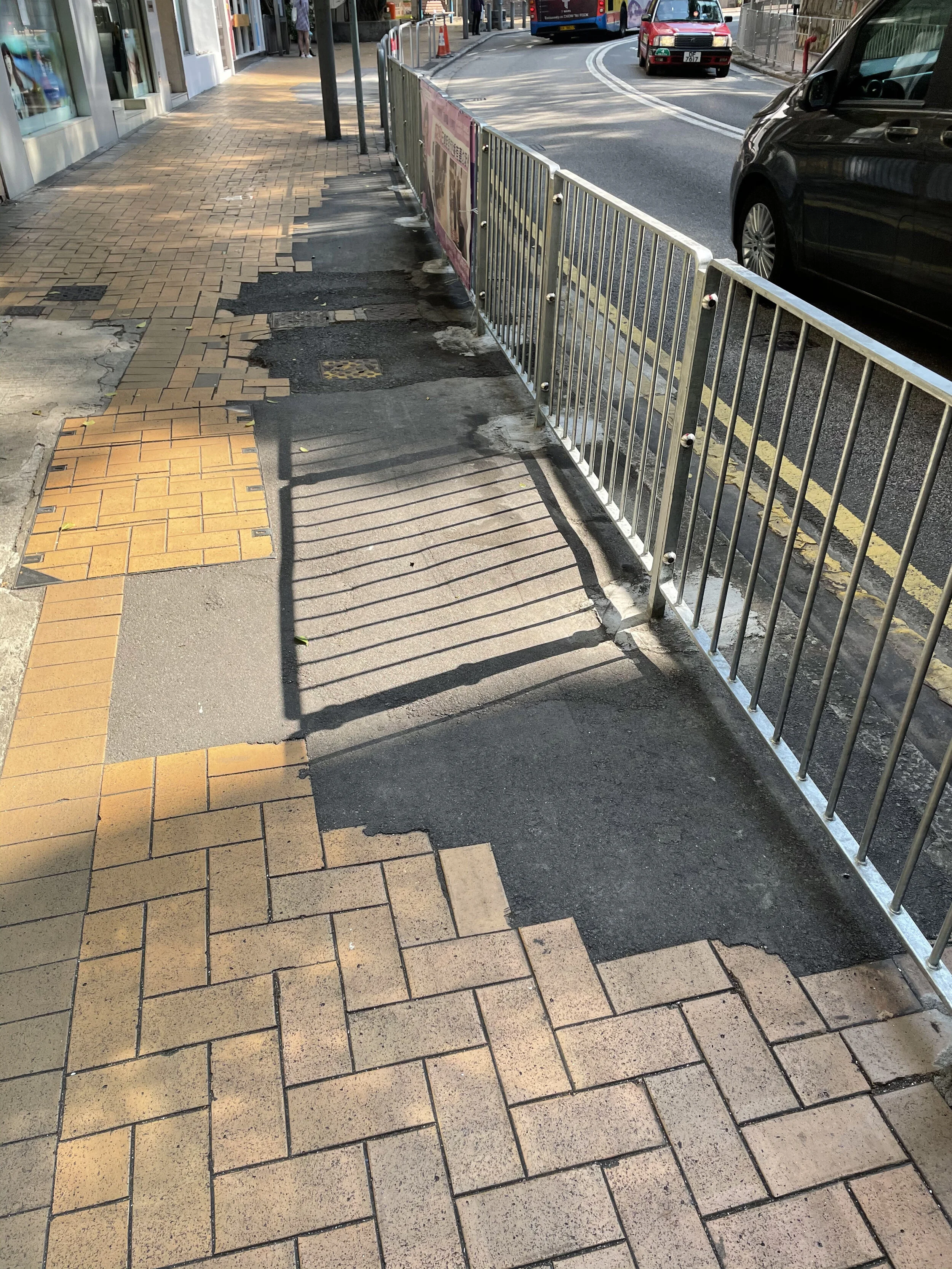 Where large sections of sidewalks were undone, workers quickly filled gaps with poured concrete or bitumen, leaving rough or smooth splotches edged by the remaining bricks (Figure 10). It seems unlikely, with the time that has gone by, that the Highways Department will invest in redoing these surfaces, each with their own mini topology.