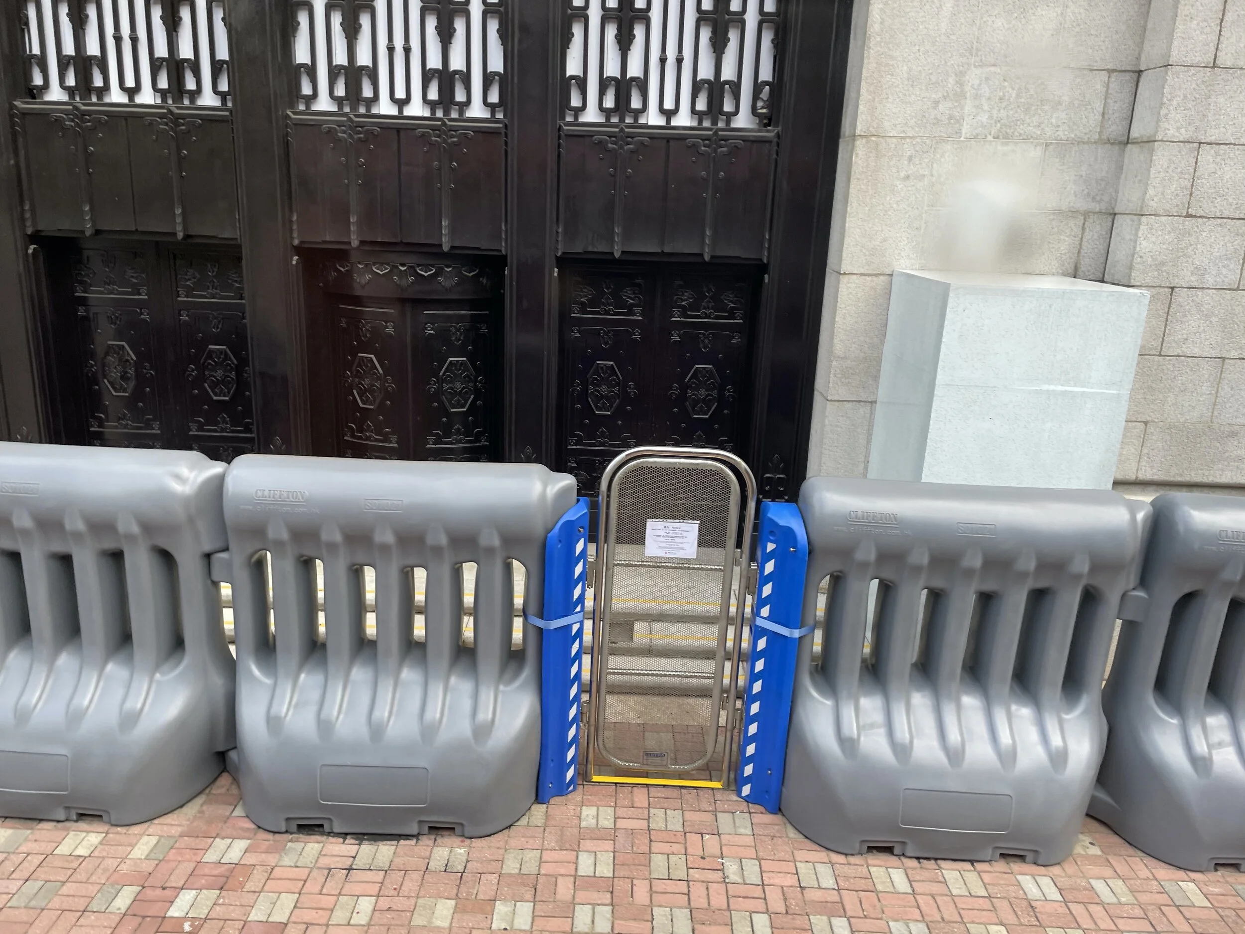 Figure 1. Water-filled barricades outside of the old Bank of China building on Queen’s Road Central. Photograph by Sony Devabhaktuni, 2020.