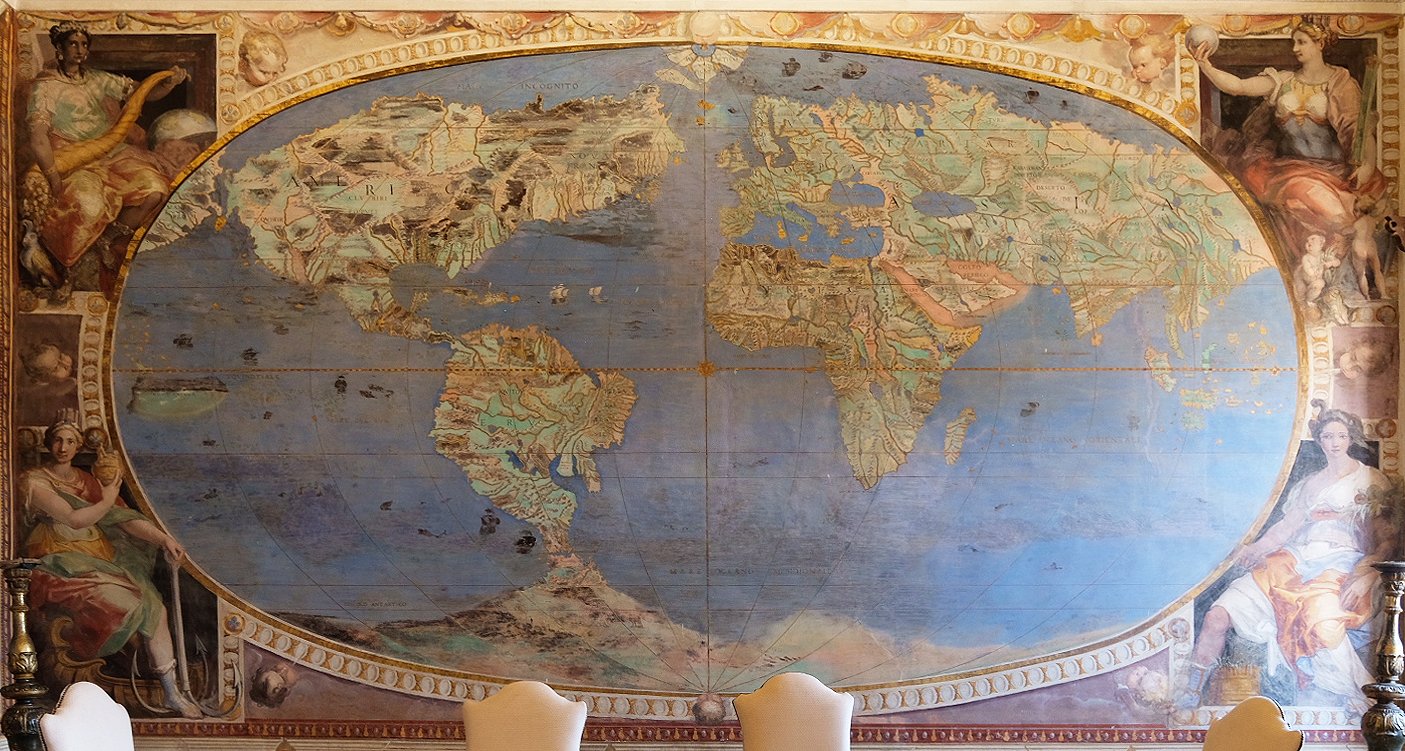 Figure 3. World map with racialized representations of the continents in the Sala del Mappamondo in the Villa Farnese in Caprarola. Photograph by author, 2024.