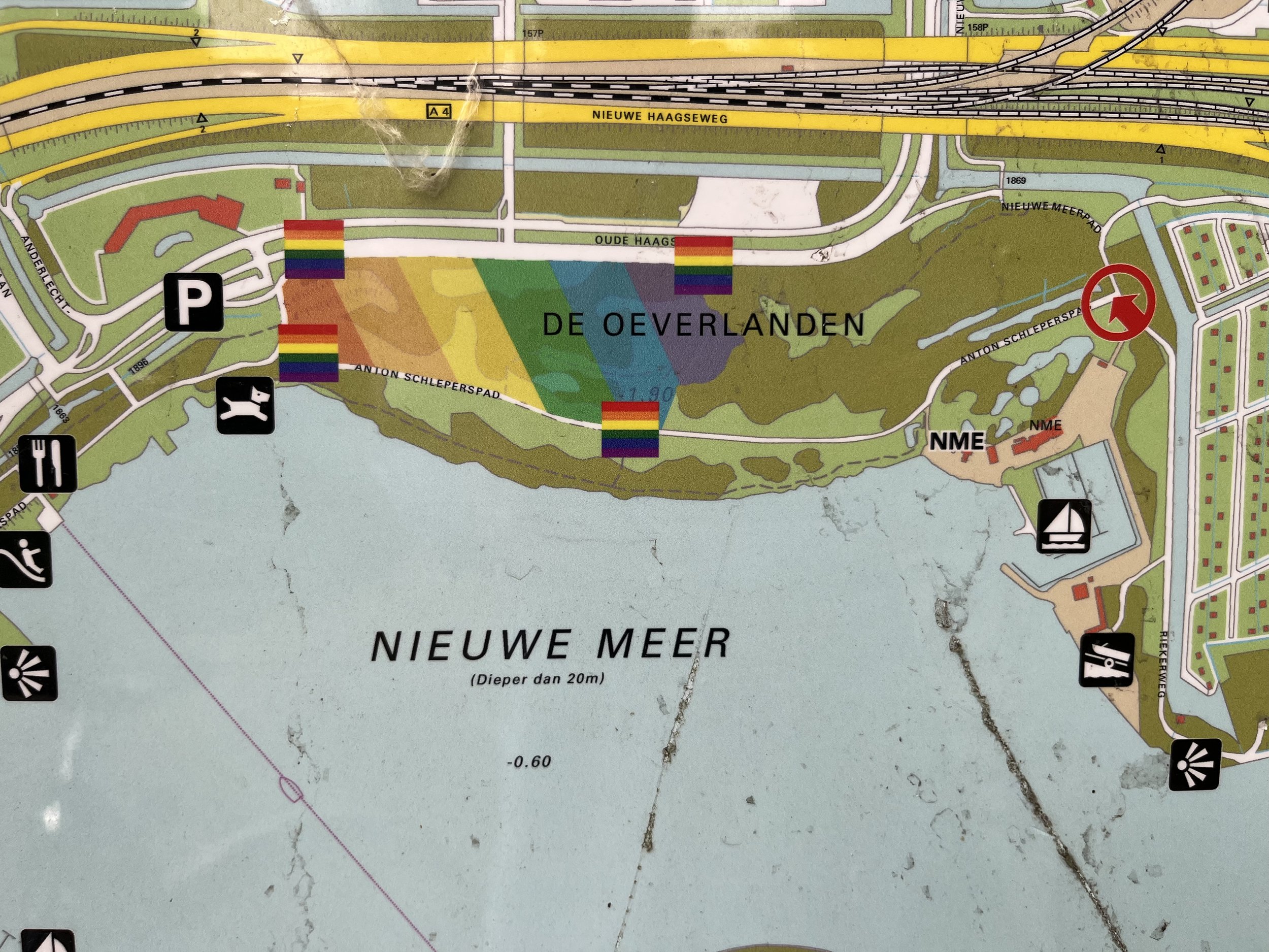 Wat de Oeverlanden uniek maakt, is dat cruisen hier, ondanks het feit dat openbare seks in Nederland illegaal is, wordt gedoogd door de gemeente. Bij de ingang van het park treffen bezoekers een groot houten bord met een plattegrond aan, waarop een deel van het park is gemarkeerd met een regenboogvlag en aangeduid als cruisegebied (fig. 1 en 2). Deze publieke aanduiding komt op meerdere plekken in het park voor en erkent de praktijk, terwijl zij deze tegelijkertijd afbakent: seksuele ontmoetingen zijn uitsluitend binnen deze zone toegestaan.